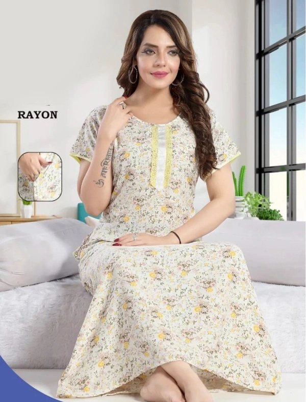Premium Quality Rayon Round Neck Printed Straight Cut Night Gown For Women